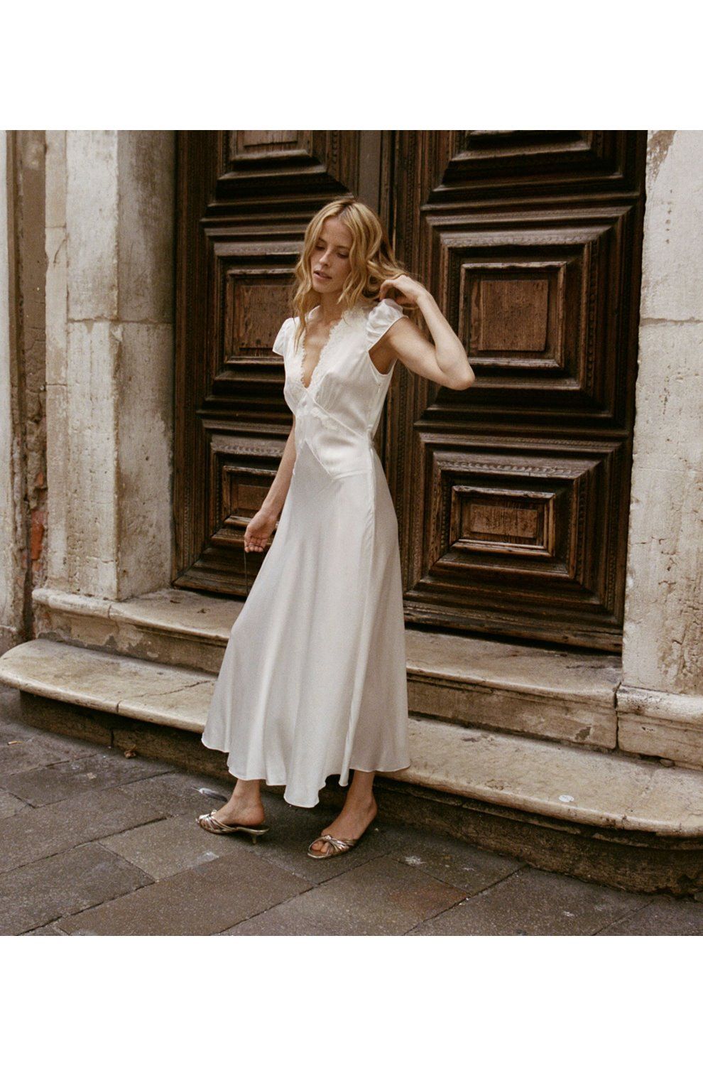 In quality, lightweight silk satin, the Coraline Dress returns this season in soft white shade Salt. In a midi length, it comes with an adjustable tie at the back and sleek bias-cut skirt. Pretty lace trims, V-neckline and fitted bodice make this elegant dress is a timeless addition to your collection.