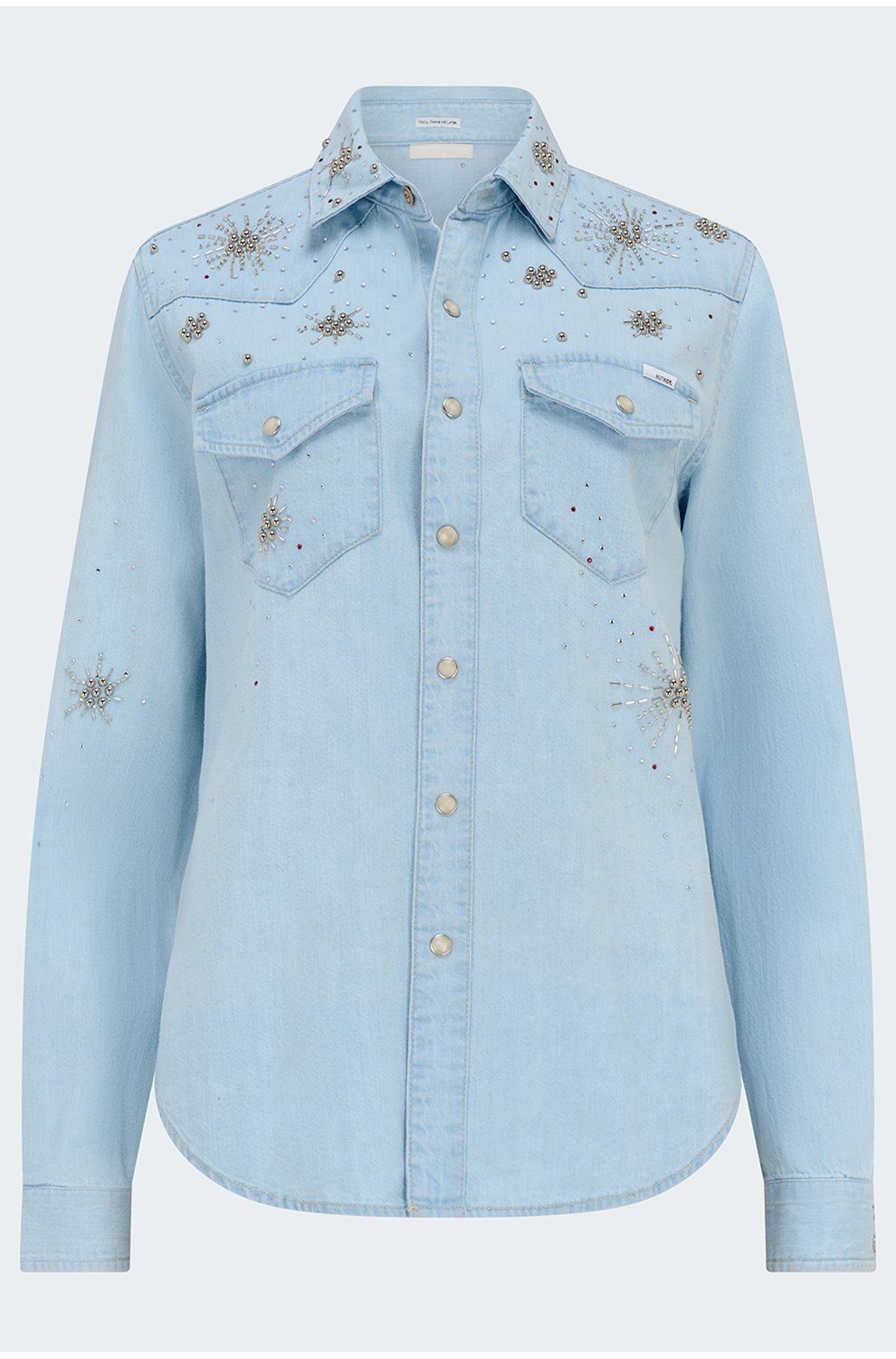 A Western-inspired denim button-up in a faded light blue wash, the All My Exes is made from 100% cotton with front patch pockets, a curved hem, faux pearl snap buttons, and beaded rhinestone detailing across the shoulders and chest.