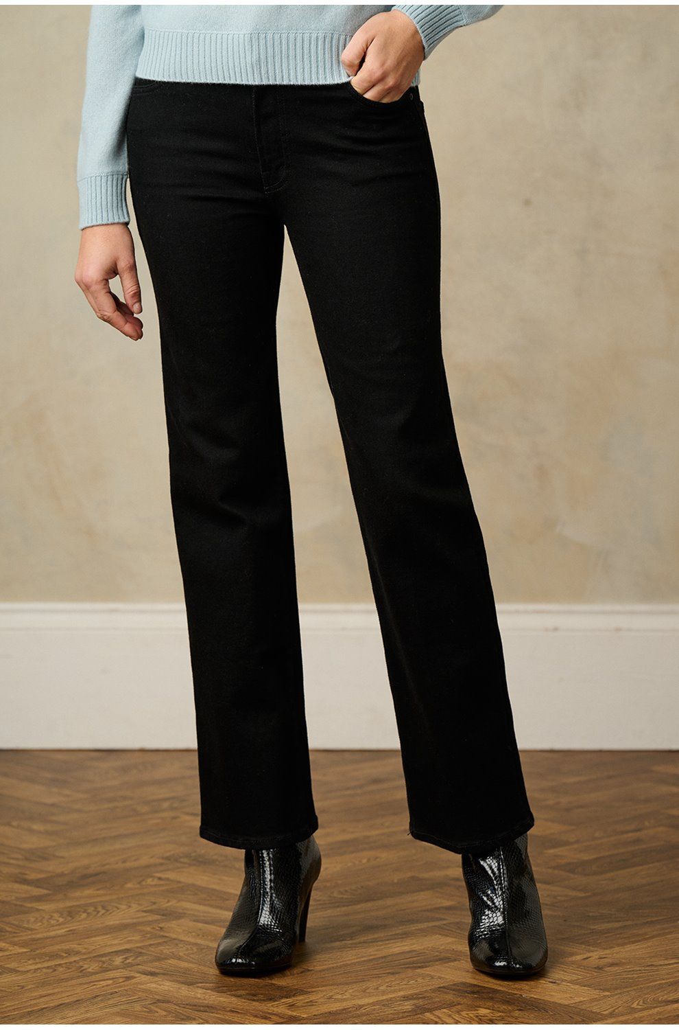 - High-rise, designed for a straight leg fit