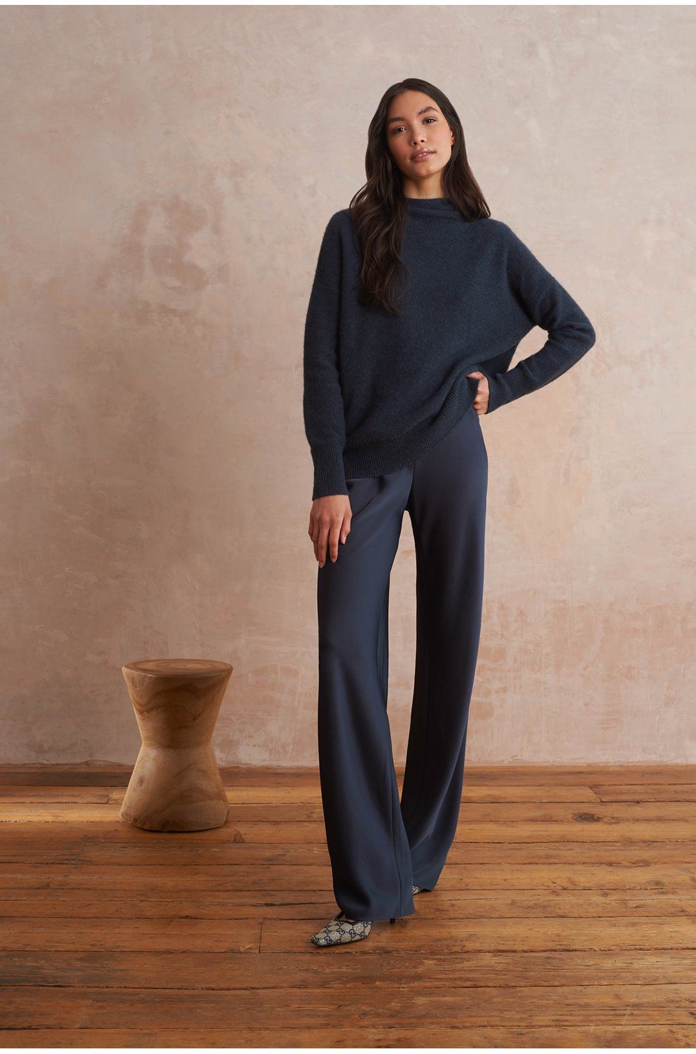 An irresistibly soft cashmere sweater with funnel neck detail, in a soft muted grey blue. With a loose fit drop sleeve and ribbed trimmings, style with dark denim for a sleek autumn ensemble.